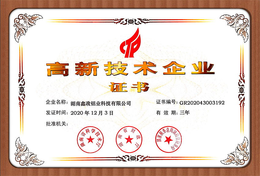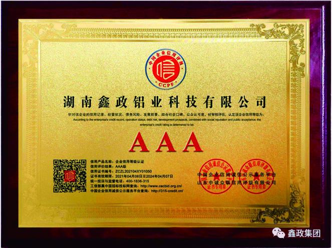 瀏覽次數:1273近日,鑫政集團子公司鑫政鋁業喜報頻傳,再獲殊榮。根據湖南省2020年高新技術企業認定規定,經專家評審、權威公示等程序,鑫政鋁業憑借產品研發、科研人才培養、質量把控等方面的出色表現,榮獲“高新技術企業”榮譽稱號。同時,經過中國企業信用誠信公示服務平臺的嚴格審核,該公司榮獲“AAA級企業信用等級”證書。